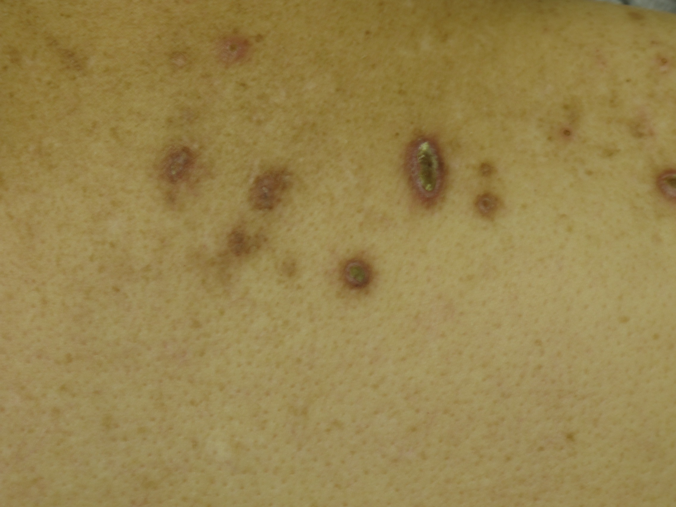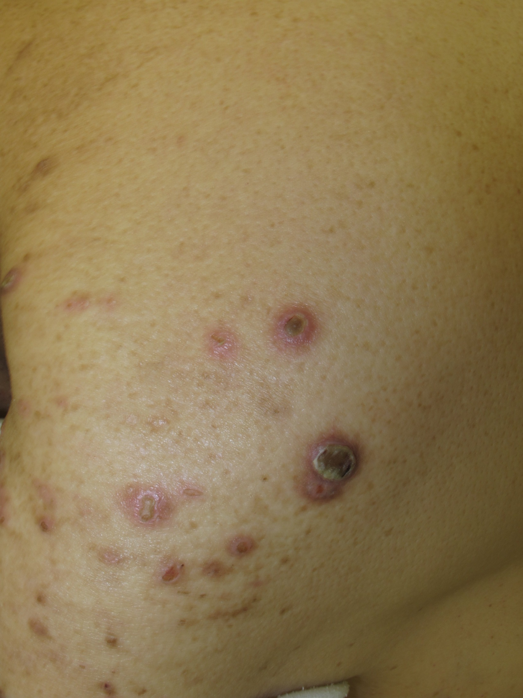 中心臍窩を有する角化性小丘疹や結節が外傷を受けやすい四肢伸側、躯幹などに多発します。糖尿病や腎不全、特に透析患者に多くみられます。他に悪性リンパ腫、肝硬変、甲状腺疾患、AIDSなどにもみられます。強い痒みに対し掻破することによる外傷が誘因になっている可能性が指摘されています。