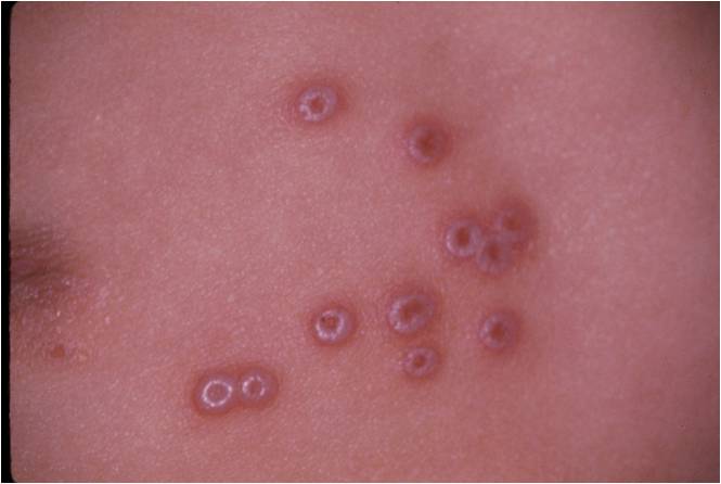 典型的な皮疹は、直径が数mm程度で皮膚面からドーム状に隆起する丘疹、ないし小結節で、皮膚色から淡紅色、淡褐色を呈しており、表面に光沢があります。中心部が陥凹し、中心臍窩を認めることが多いです。通常自覚症状はありませんが、周囲に湿疹反応を伴い軽い痒みを呈することもあります。躯幹四肢を主体に全身どこにでも生じます。