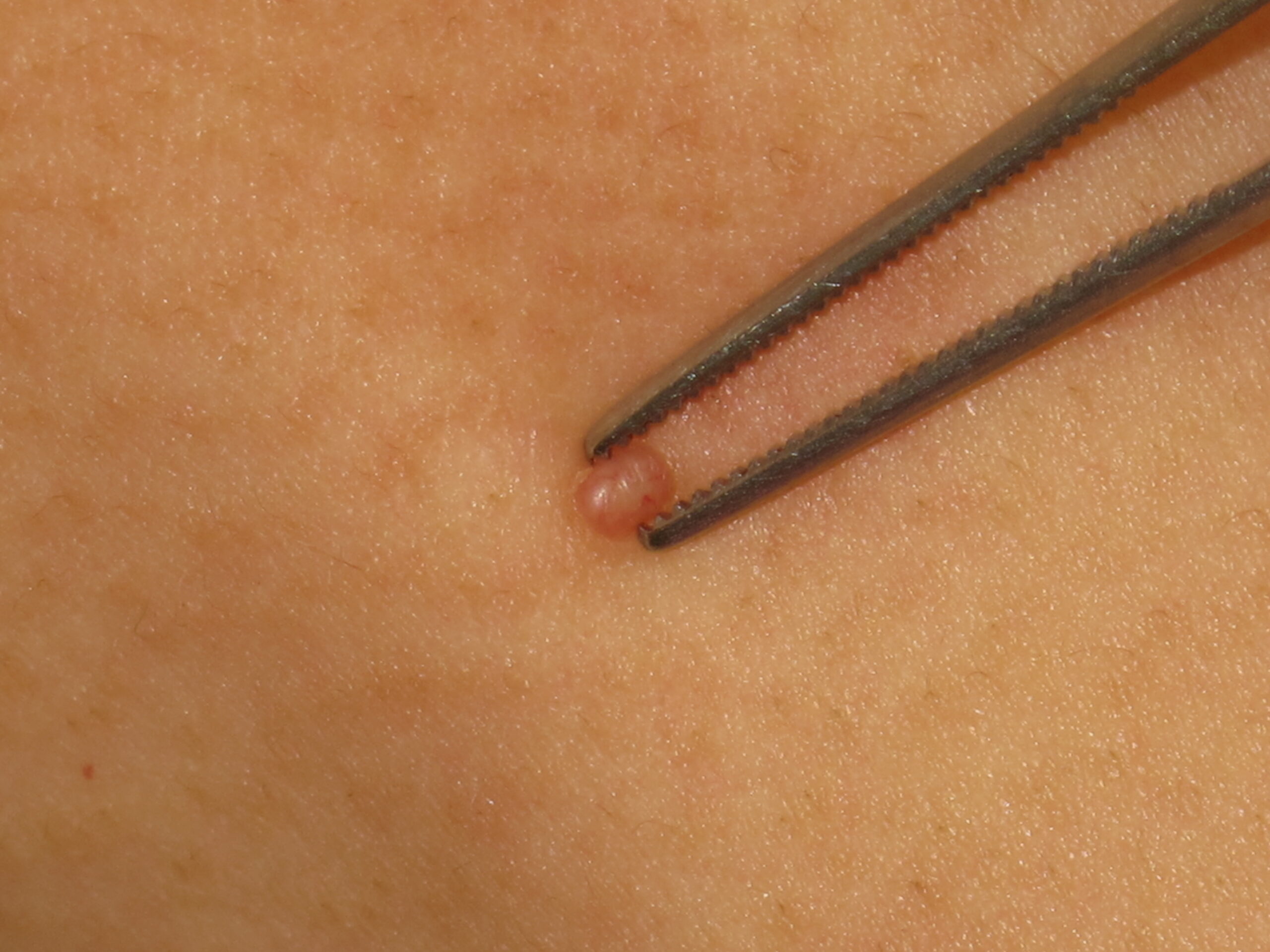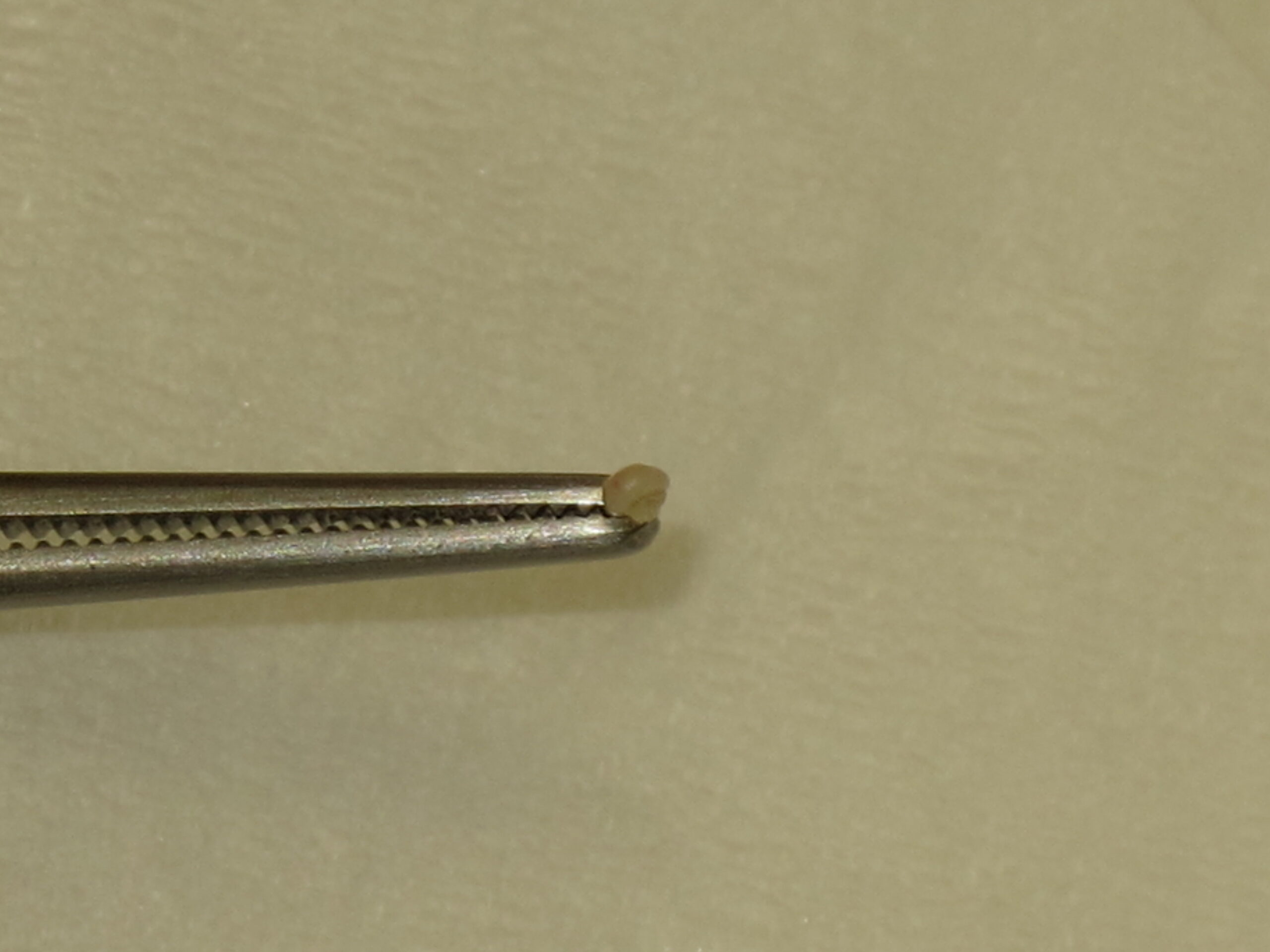 すなわち、保護者が摘除を希望し、患児も嫌がるそぶりを見せない場合は、トラコーマ鑷子などを用いて摘除を行ないます。摘除約1時間前に貼付用局所麻酔薬であるペンレステープを適当な大きさに切って皮疹部に貼ります。通常1回に2枚までとされており、麻酔薬のアレルギー反応、中毒反応には注意する必要性があります。患児が嫌がるようであれば、経過観察か疼痛のないその他の方法を考慮します。潜伏期が長期間であるために、いったん治療しても、さらに再発することが多々あります。治療は1回のみではなく繰り返しになることはあらかじめ周知しておく必要があります。