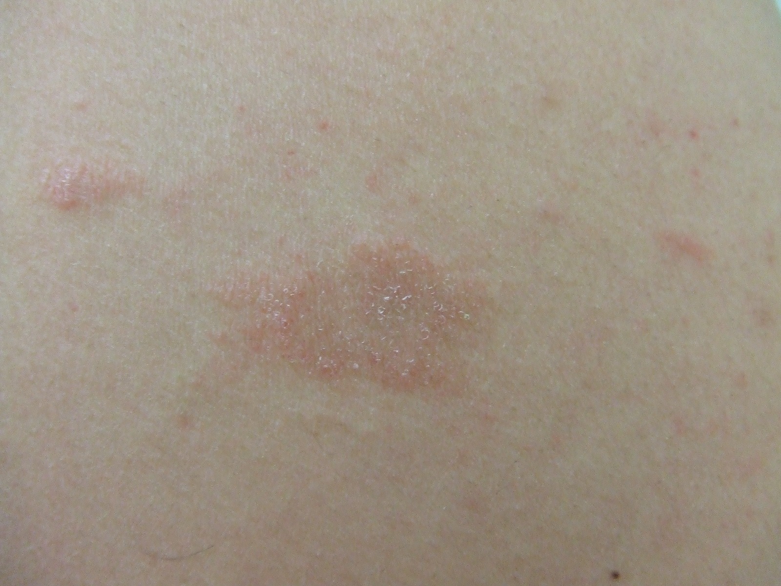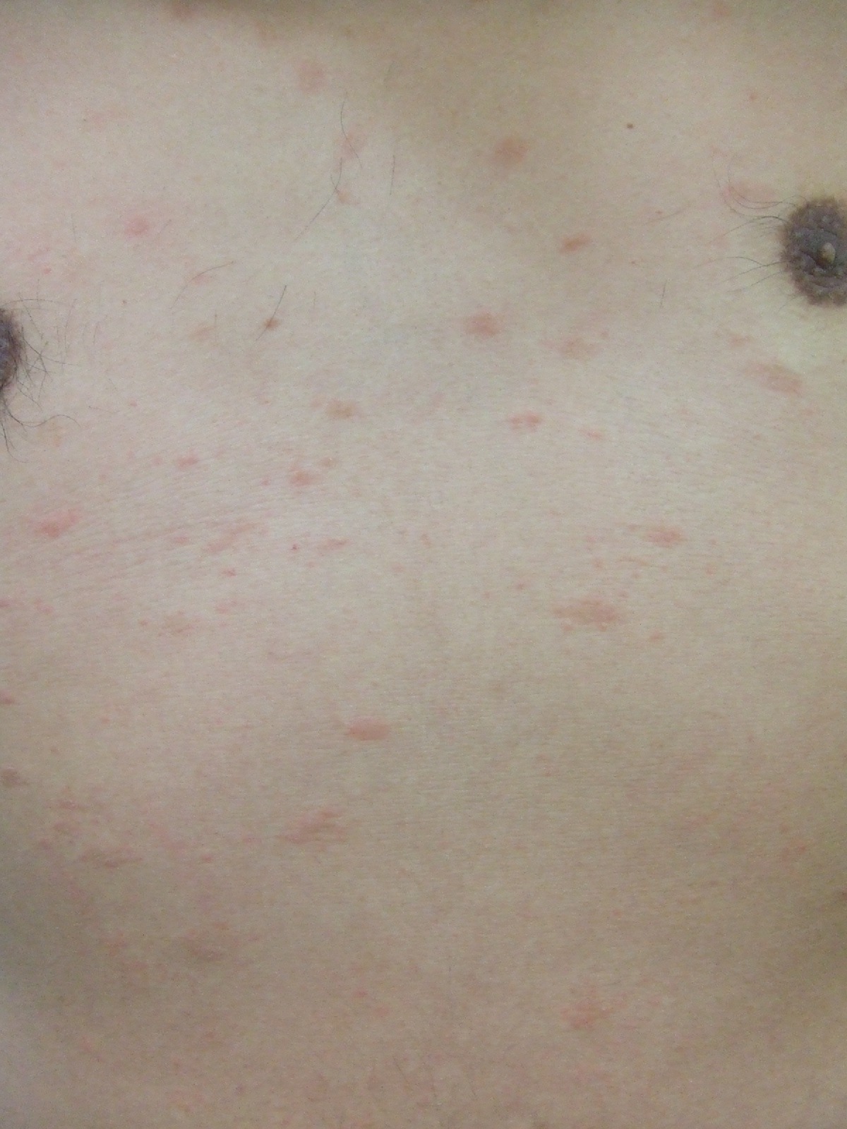 直径2~5cm程度の初発疹(herald patch)は楕円形の辺縁に襟飾り状の鱗屑を有した紅斑で主に体幹に生じます。通常単発です。その後2日から1,2週間後に、より小型の楕円形の皮疹が主として躯幹に多発してきます。これを続発疹とよびます。個々の発疹は1~2cm大の大小不同の紅斑で辺縁に環状の鱗屑を付し、その長軸は皮膚の割線方向に一致します。背部ではその配列がクリスマスツリー状に見えます。一部では鱗屑のない紅色丘疹も混在してみられることもあります。痒みはないか、あっても僅かです。時に頭痛、発熱など風邪症状を伴うこともありますが、軽度です。